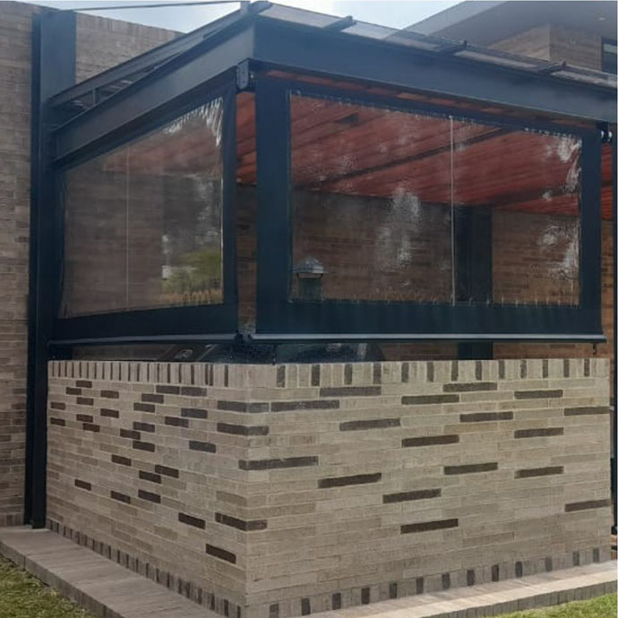 Los ofrecemos con un sistema guiado a través de guayas laterales que permiten enrollar y desenrollar el toldo a conveniencia o con anclajes al piso.