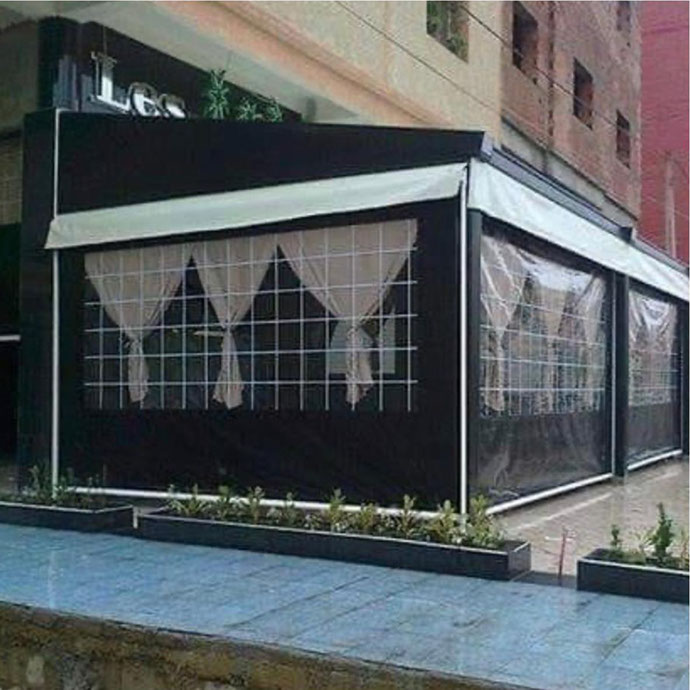 Elaborados en PVC transparente o en PVC transparente con diseño. El contorno de los toldos puede ser en PVC (green, black o white) o en lona acrílica (diversos colores).
