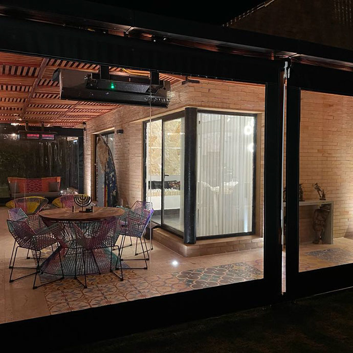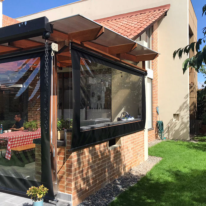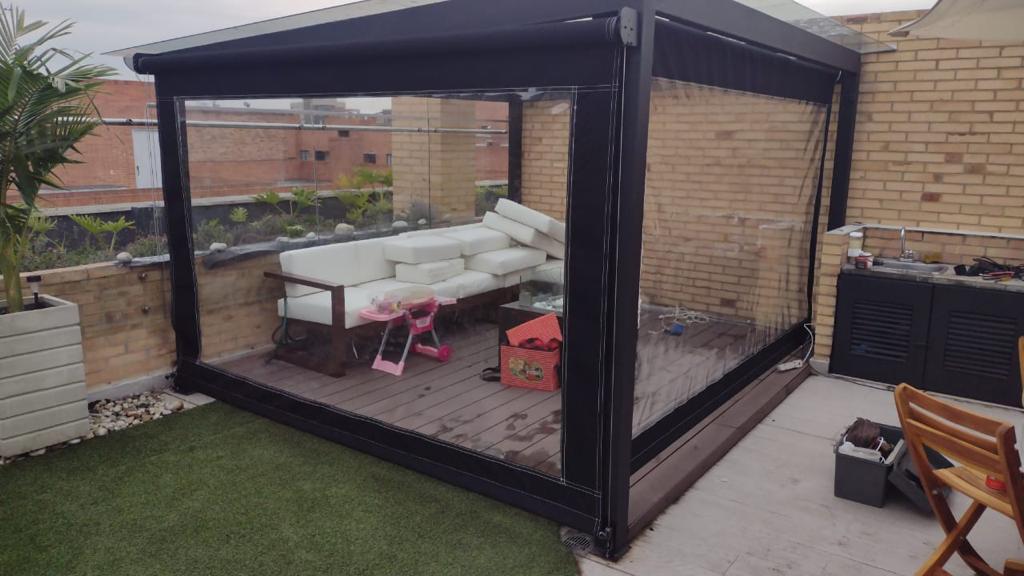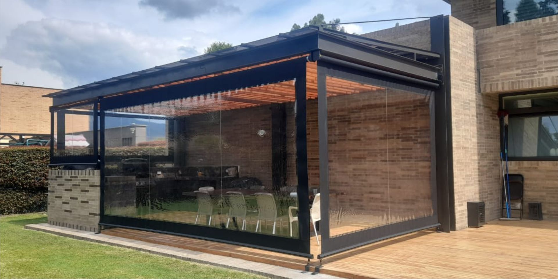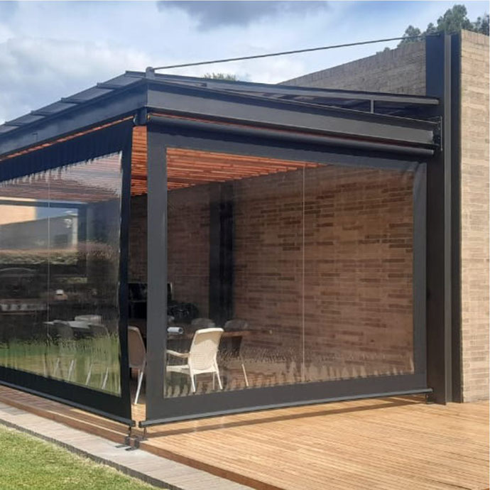 Los ofrecemos con un sistema guiado a través de guayas laterales que permiten enrollar y desenrollar el toldo a conveniencia o con anclajes al piso.